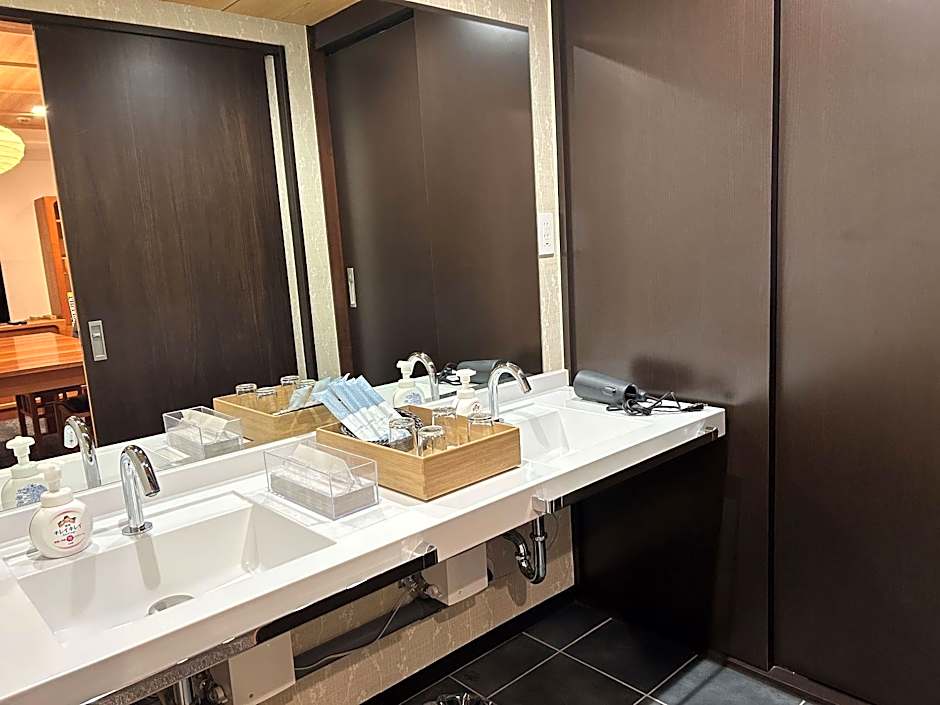 The spacious family room features air conditioning, tatami, as well as a private bathroom boasting a bath and a shower. The unit has 10 futons.