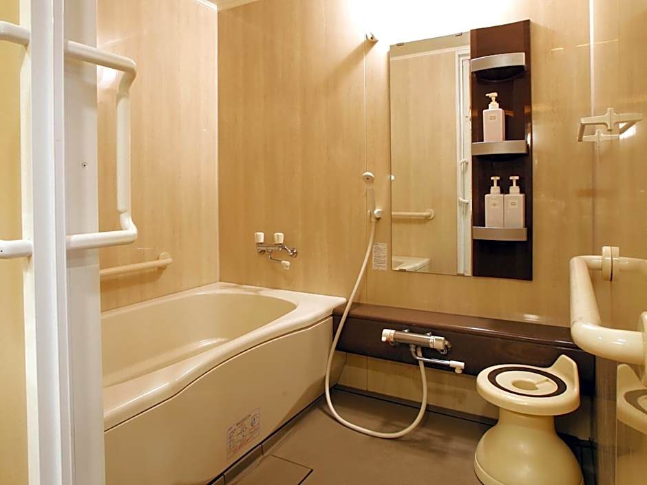 The quadruple room offers air conditioning, tatami, as well as a shared bathroom featuring a bidet and a hairdryer. The quadruple room features a flat-screen TV, a wardrobe, yukata, heating as well as city views. The unit offers 4 futons.